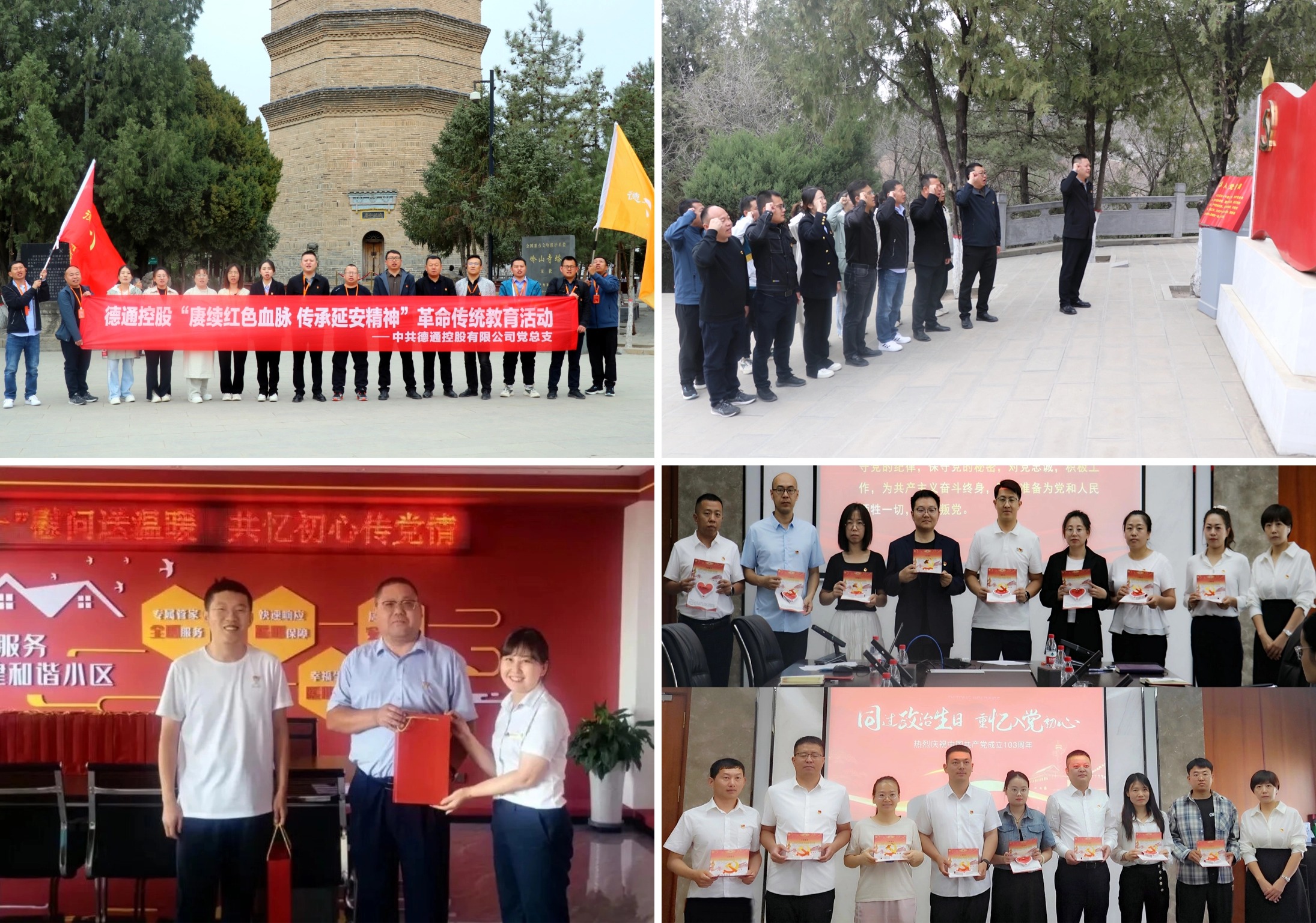3月份,德通控股党总支组织党员干部赴革命圣地延安开展红色主题教育活动,观旧址、逛枣园、登宝塔、看红秀,感受红色力量和红色精神;4月份,组织开展“缅怀先烈 致敬英雄”清明节主题观影活动;7月份,组织开展“同过政治生日,重忆入党初心”迎七一主题党日活动,与党员们共同庆祝中国共产党成立103周年;德安物业党支部在各小区开展了“七一慰问送温暖,共忆初心传党情”主题活动,为业主党员们发放七一纪念品并致以节日的问候。