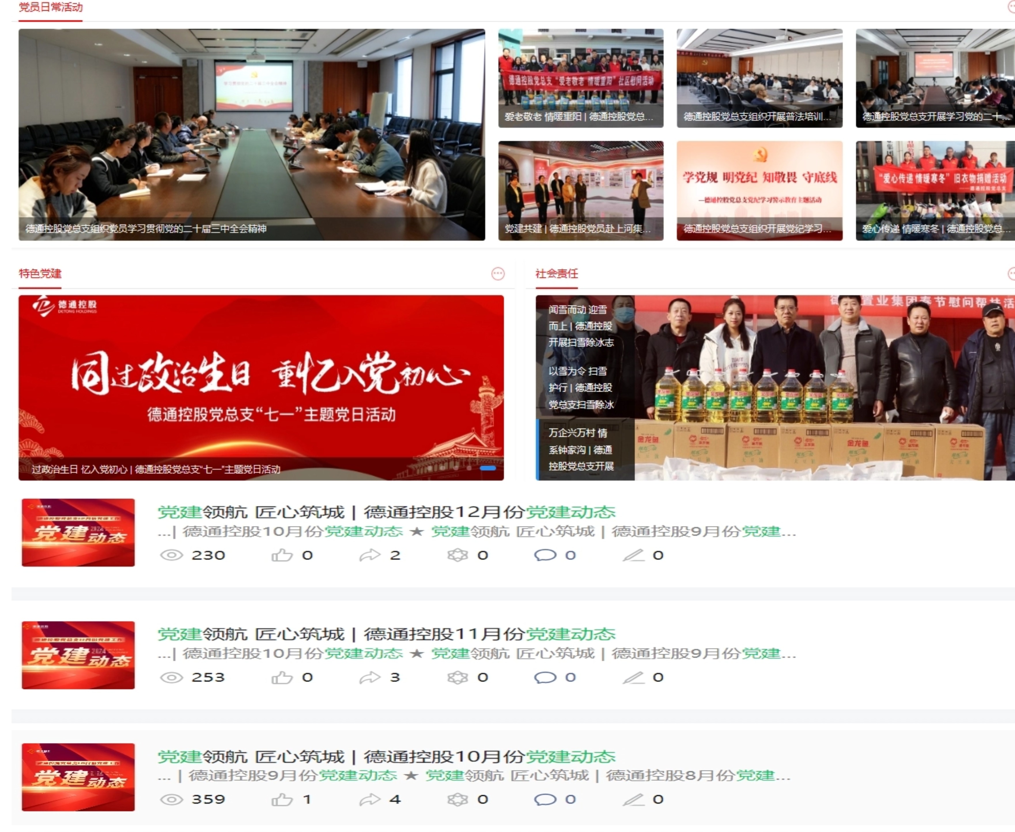 德通智慧党建旨在通过信息化手段,在党员教育、党员管理、党建工作考评等方面赋能增效,有效融合企业经营管理与党建工作。2024年,党总支通过微信公众平台的“党建动态”专栏发布每月党建活动汇总12篇,通过”智慧oa平台”发布党建类新闻32条,凝聚了员工共识,汇聚了党建力量,促进了党员日常交流。