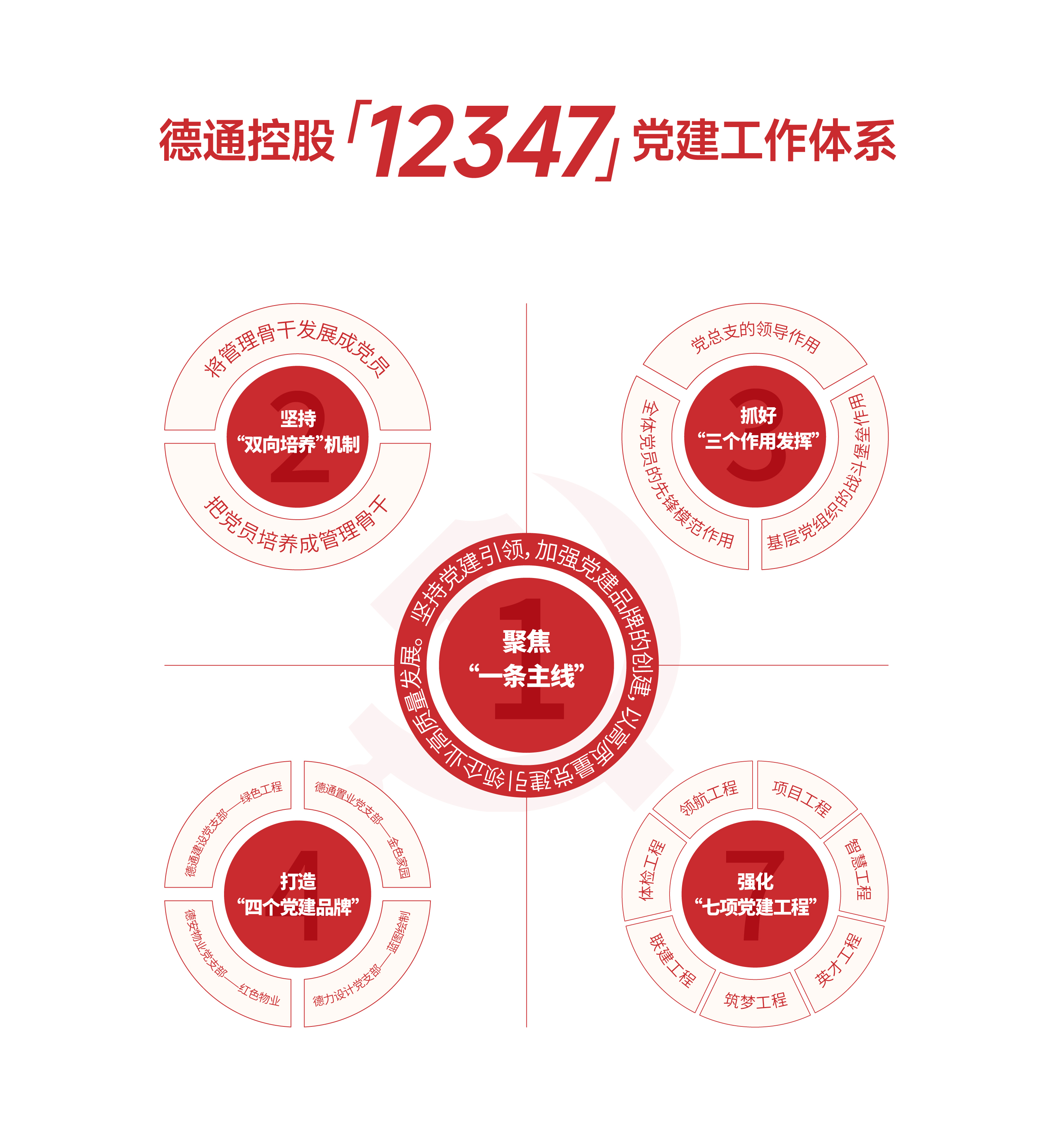 构建德通控股“12437”党建工作体系,推动党建工作理念创新、机制创新、方式创新,为公司坚持党的领导,加强党的建设提供指引,确保德通行稳致远、健康发展。