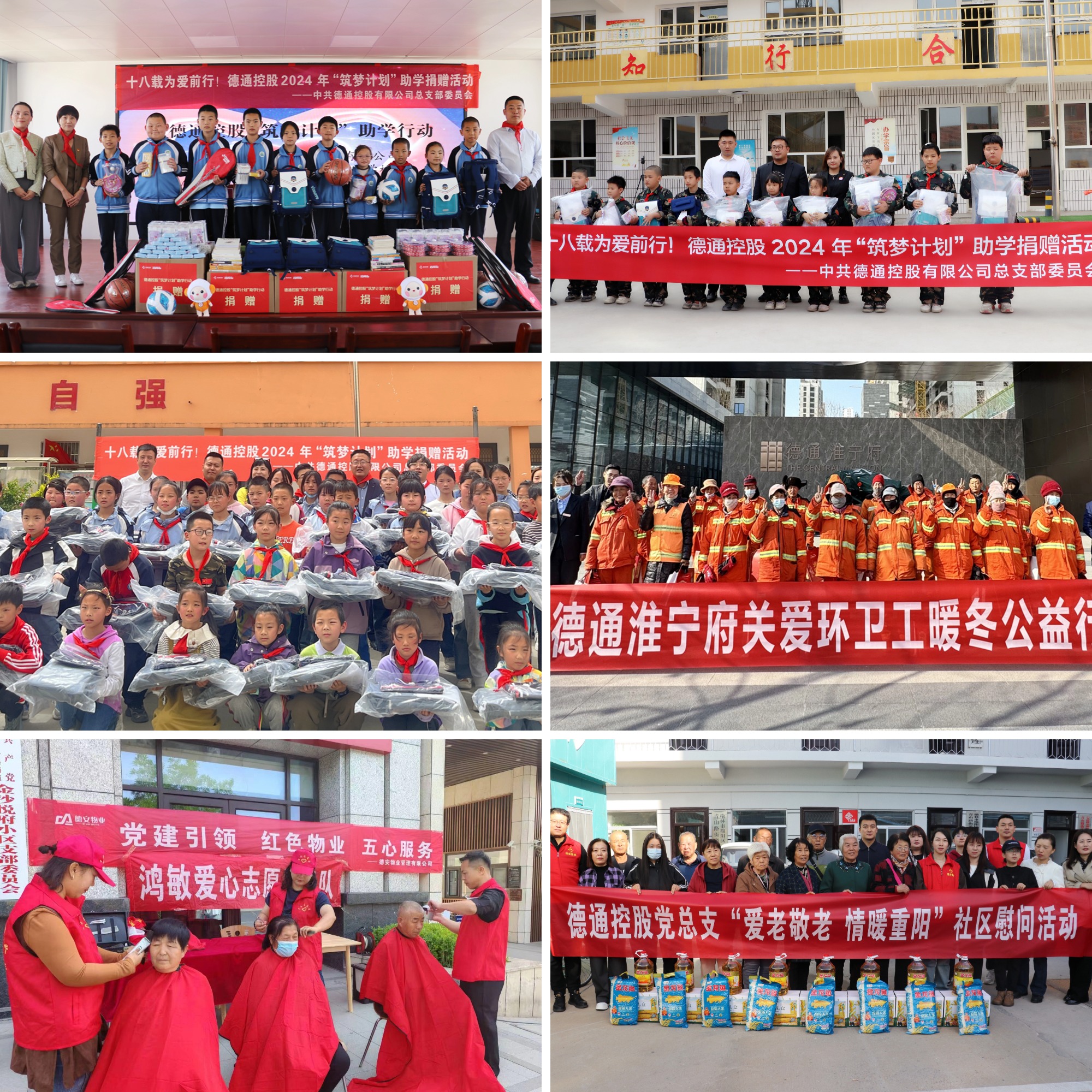 2月份,德通置业集团党支部组织党员志愿者开展“春节送温暖”关爱环卫工人爱心物资发放活动,德安物业党支部组织党员为小区内独居老人、残疾人士等困难群体送去生活物资;4月份德通控股成立十八周年之际,德通控股党总支组织发起“筑梦计划”助学行动,为偏远地区的孩子们送去价值约20万元的爱心物资,为他们创造更好的学习和成长条件;5月份,德安物业党支部在小区内开展爱心义剪,为业户免费理发;6月份,为预祝广大学子高考顺利,德安物业党支部组织全体物业服务中心发起“静音助考”行动;9月份,德安物业党支部在多个小区组织开展“花好月圆,趣玩中秋”游园会活动;10月份,德通控股党员们来到文化路社区,为社区高龄老人、特困老人送上米、油、杂粮等慰问物资和节日祝福。